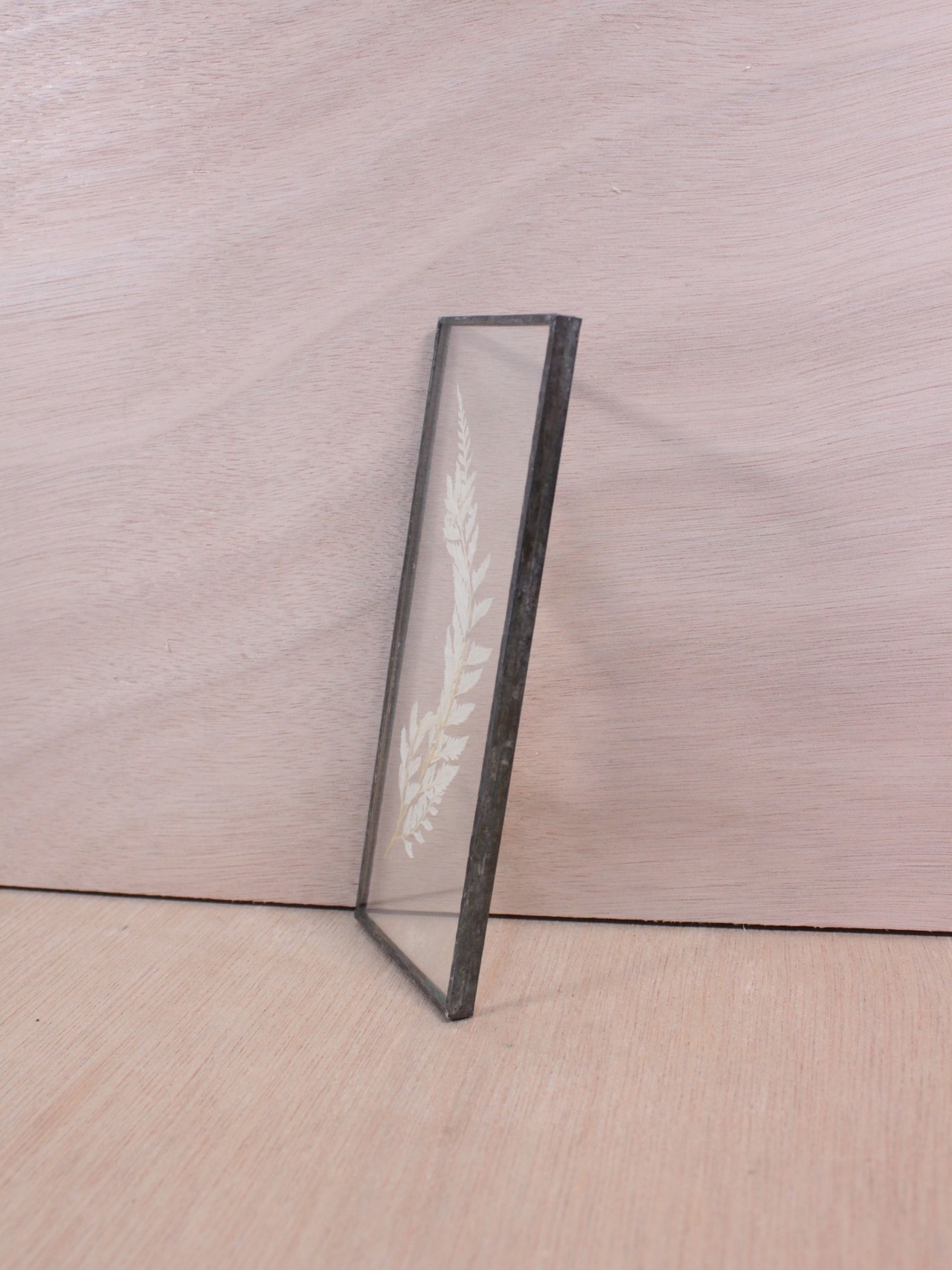 古いガラスと鉄のフレームの中に、葉っぱが入っています。