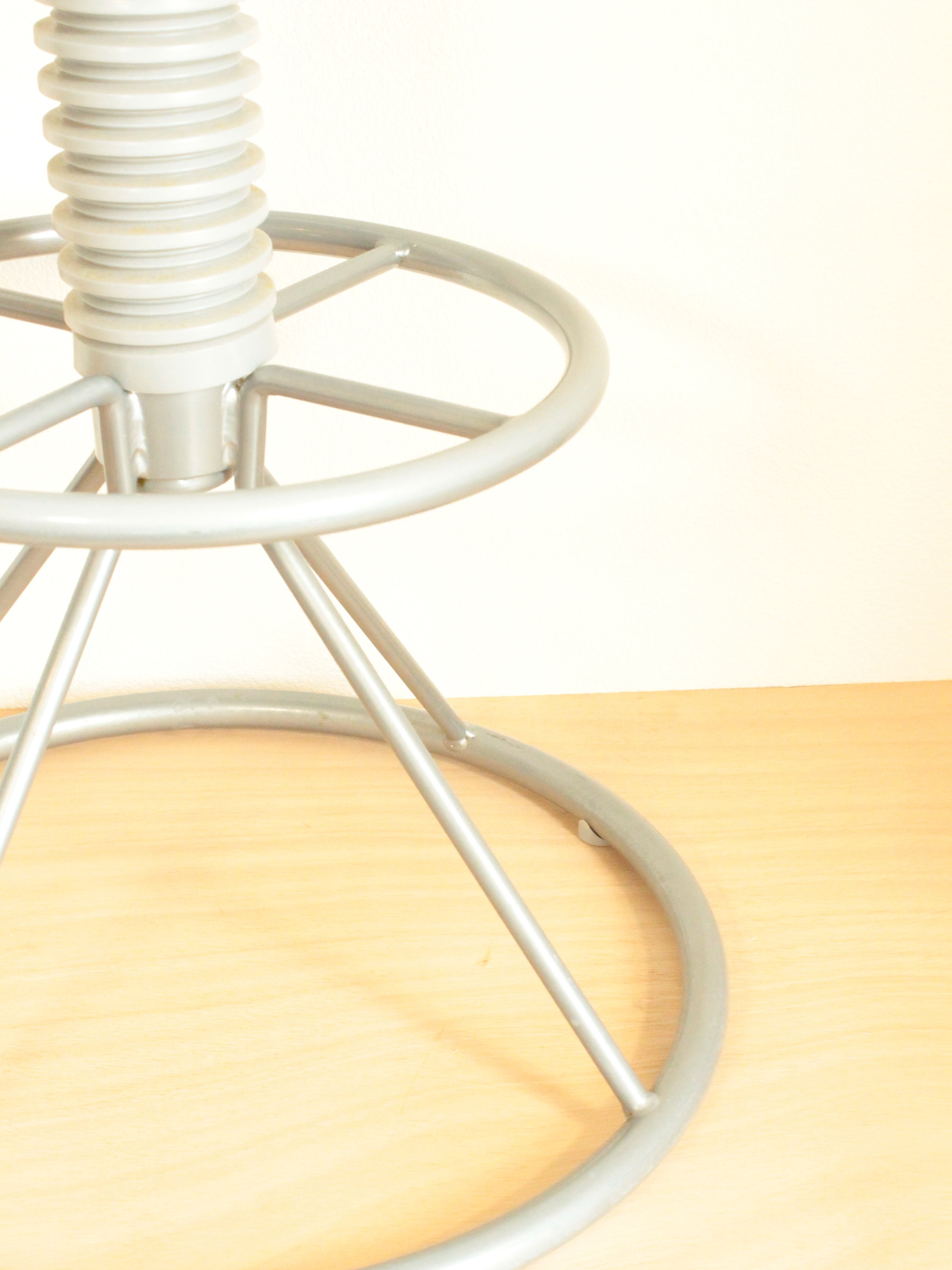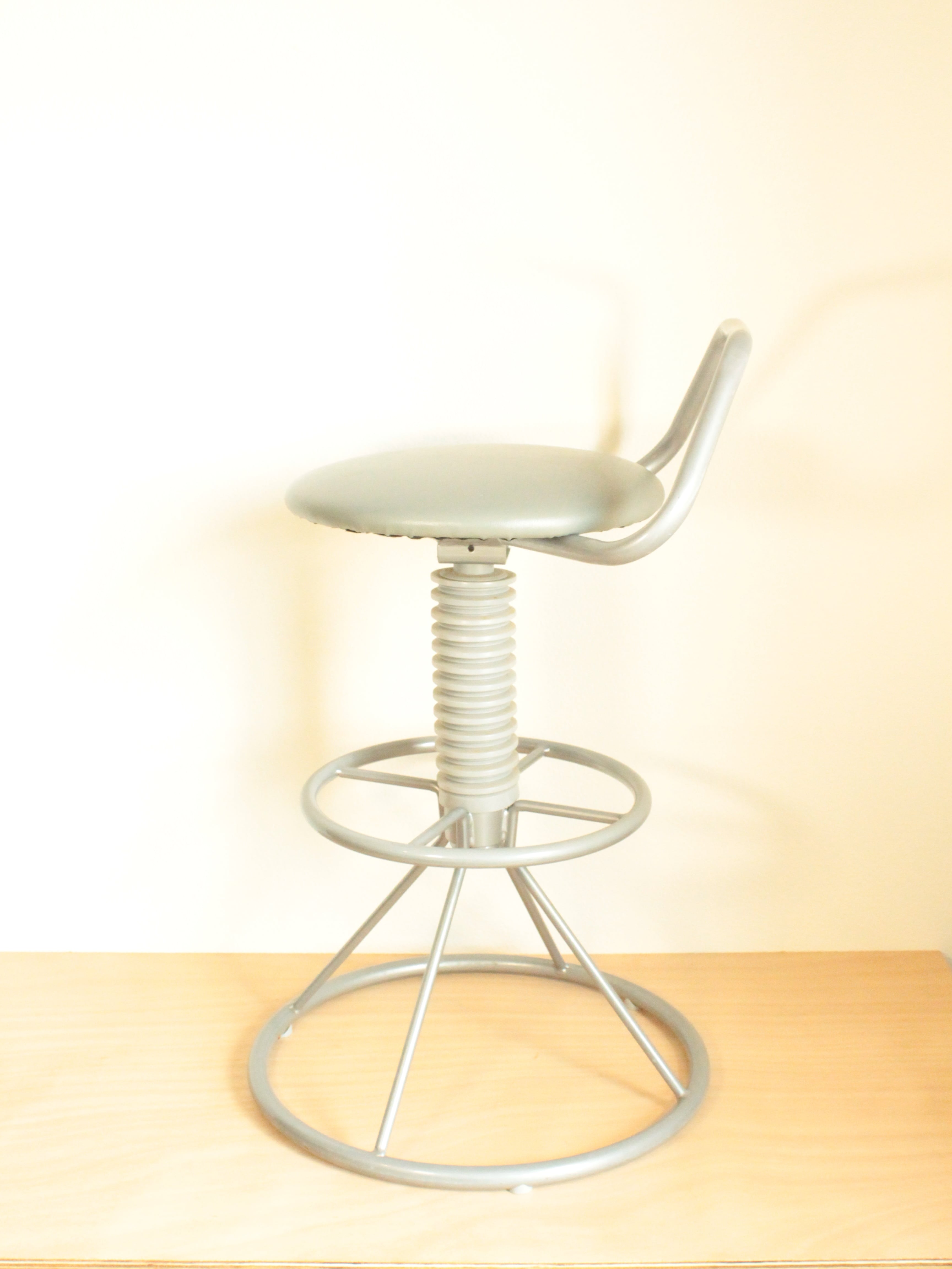 小ぶりな背もたれ、バネのようなレッグカバー、サークル状に広がった脚部。