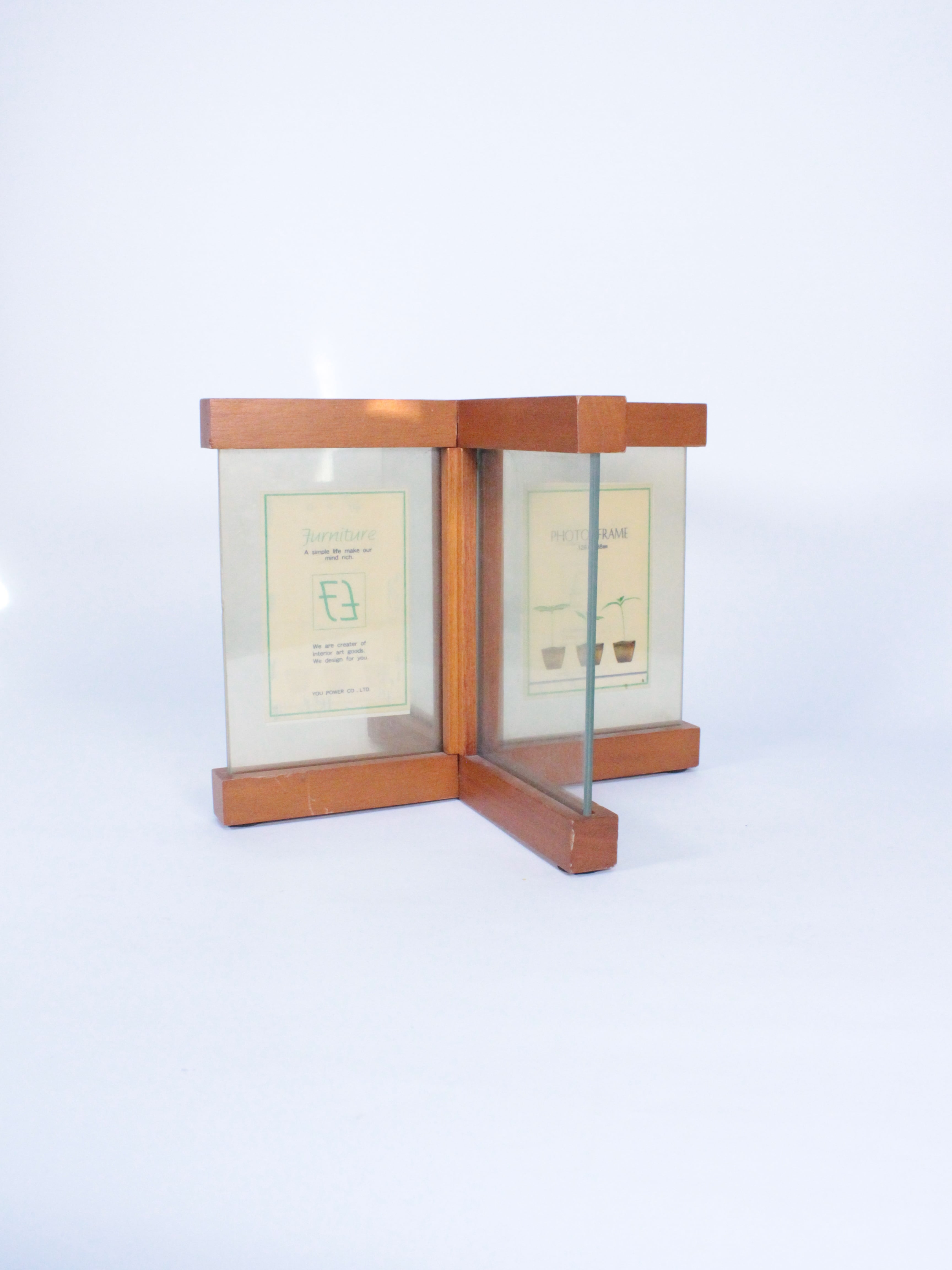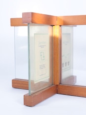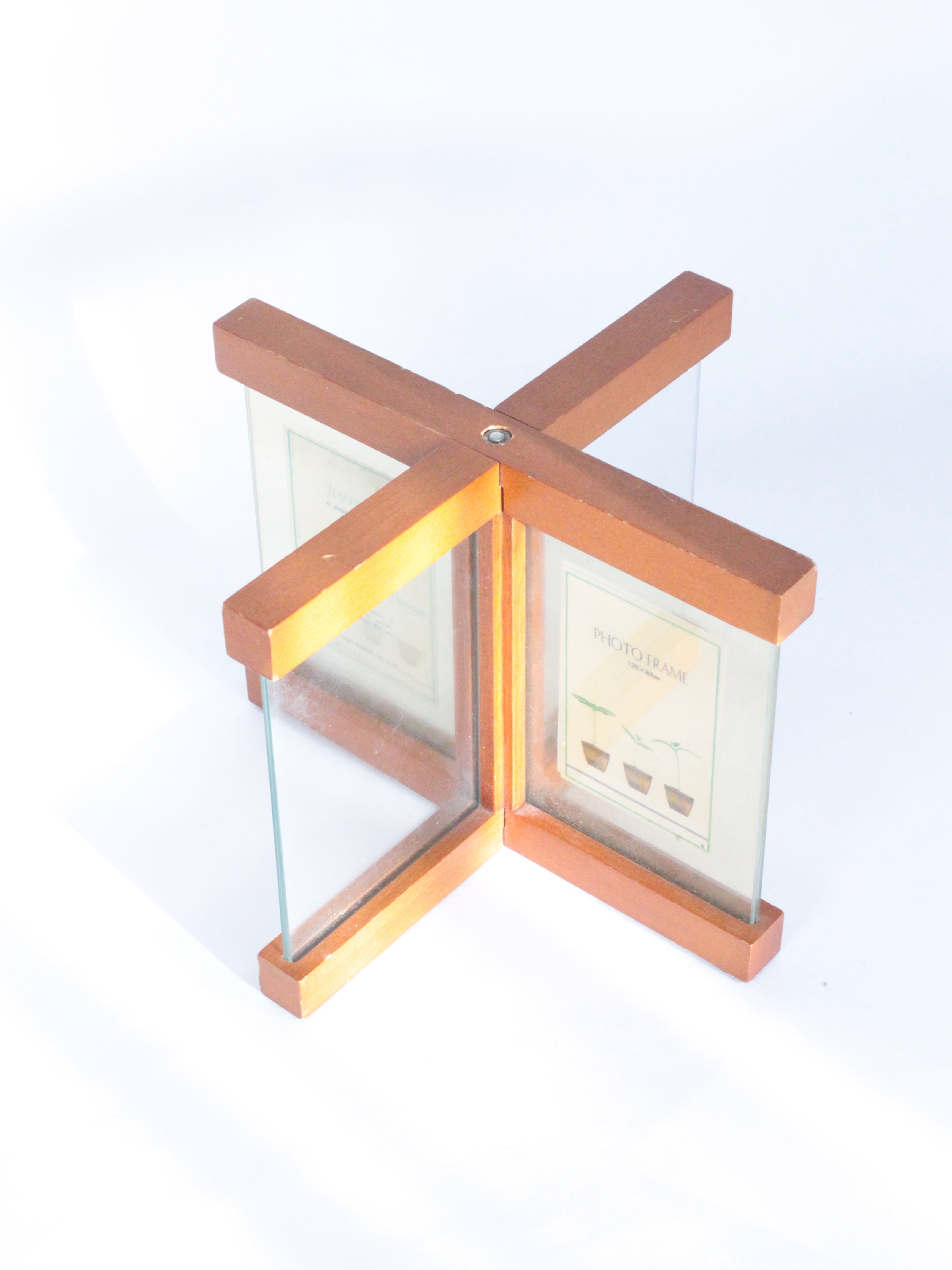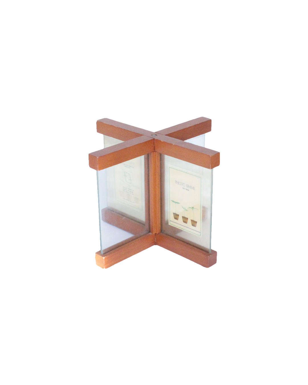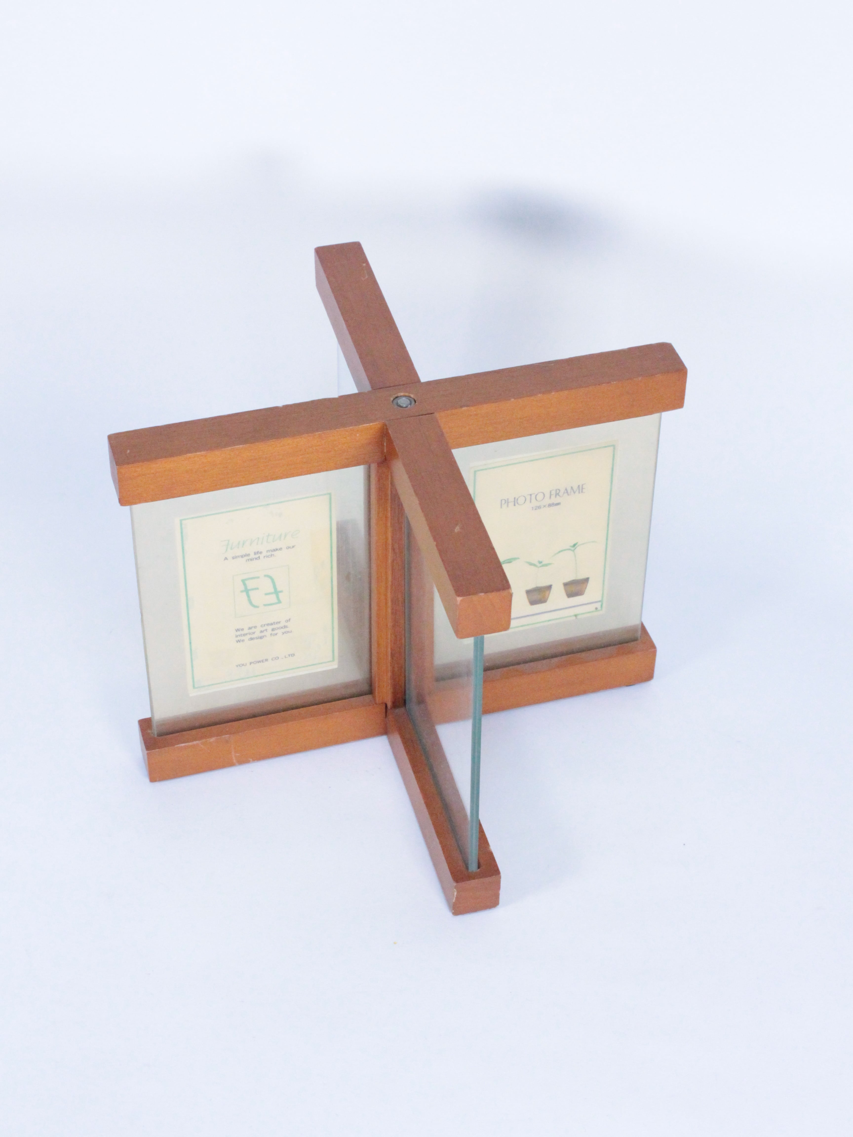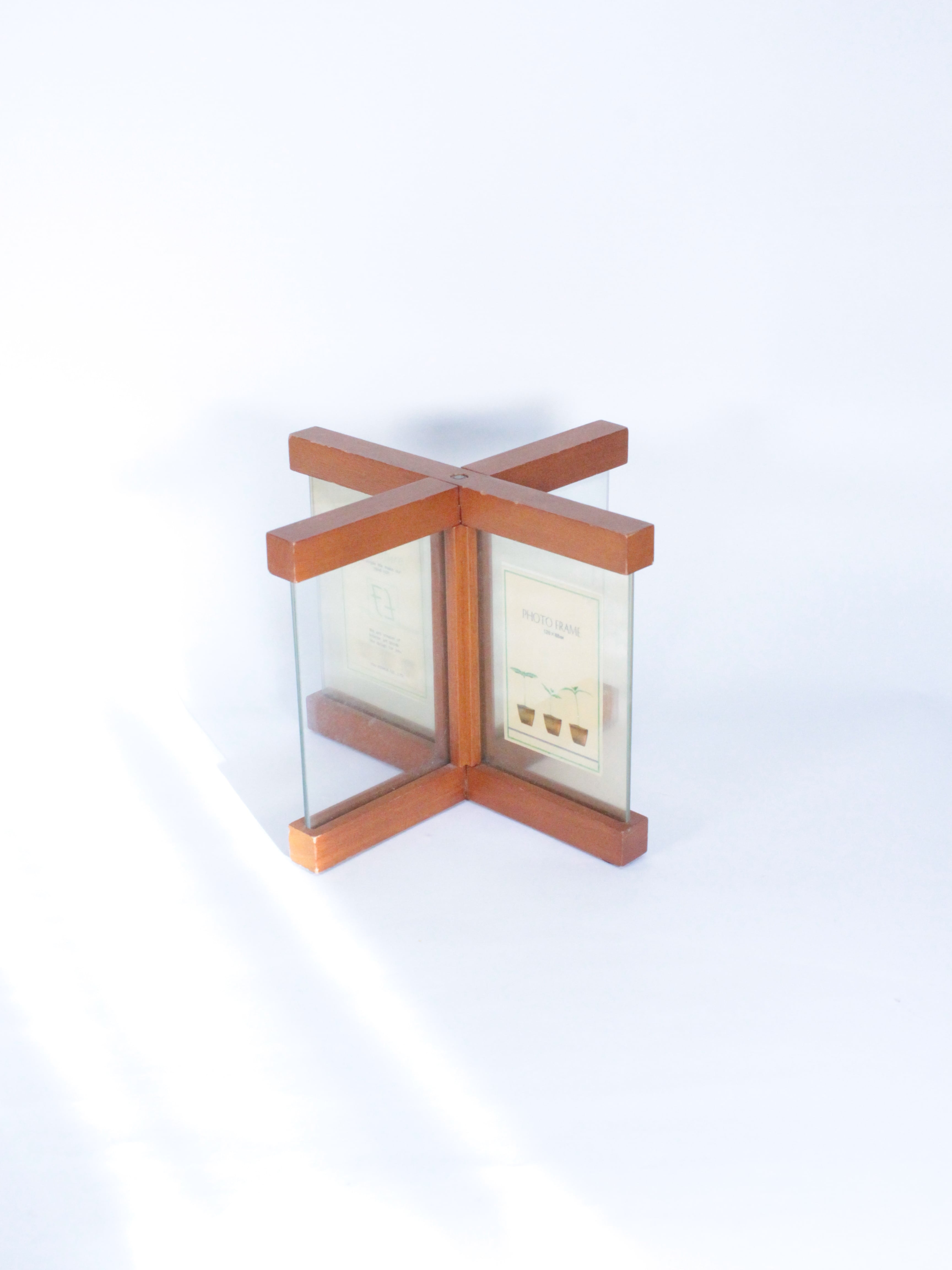 十字に組み合わさった木製のフォトフレーム。