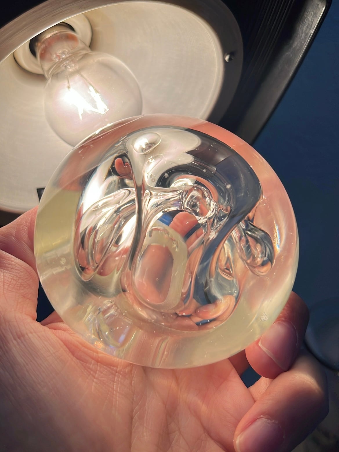 うねる気泡が閉じ込められたようなペーパーウェイトです。